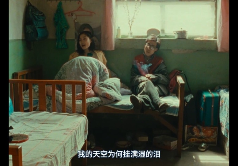 胡梅梅和父母打电话,报喜不报忧,甚至是谎报喜。电话里说自己在北京面试一位导演,实际情况是她在山西小县城做着歌女的工作,五十块钱就可以让她出去陪客人。住在落魄嘈杂的群租房,水管不出水需要自己用口吸出来,生病了也没钱看病买热水袋。 两个人坐在床边,胡梅梅唱王菲的《天空》,唱着唱着就流泪了,我的天空为何挂满湿的泪。小武此时也不知道怎么安慰她,胡梅梅趴着他身上哭泣,他轻拍着她的肩。小武和胡梅梅是同属于边缘底层,互相依偎取暖。电影里少见的温暖美好的画面。