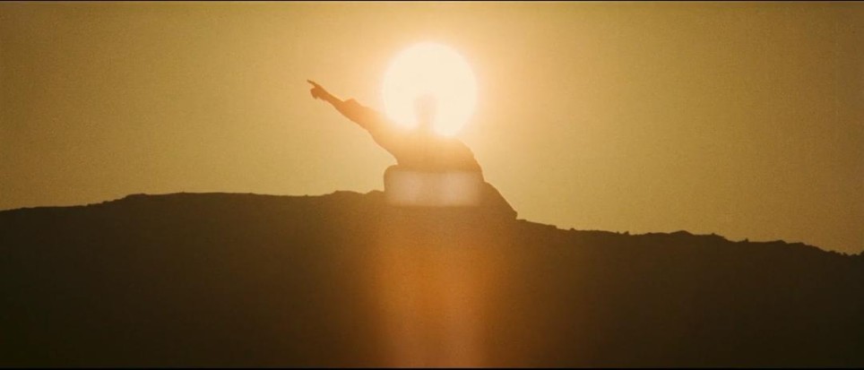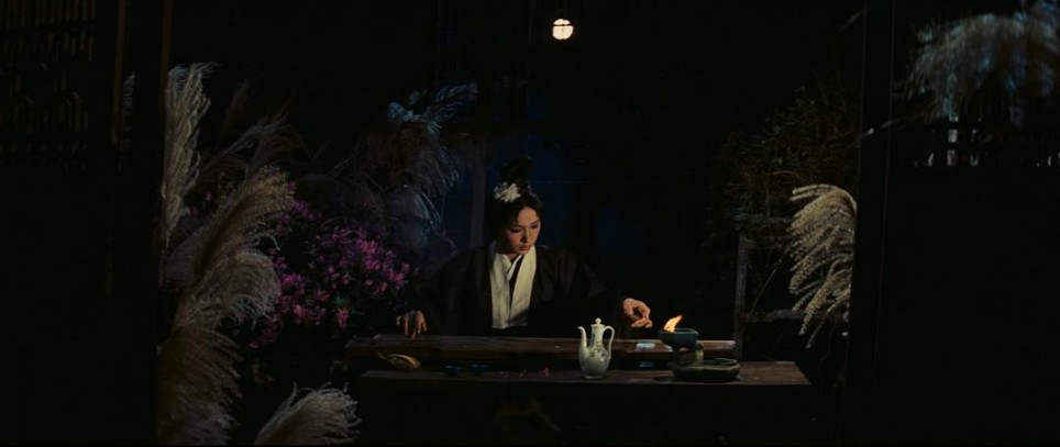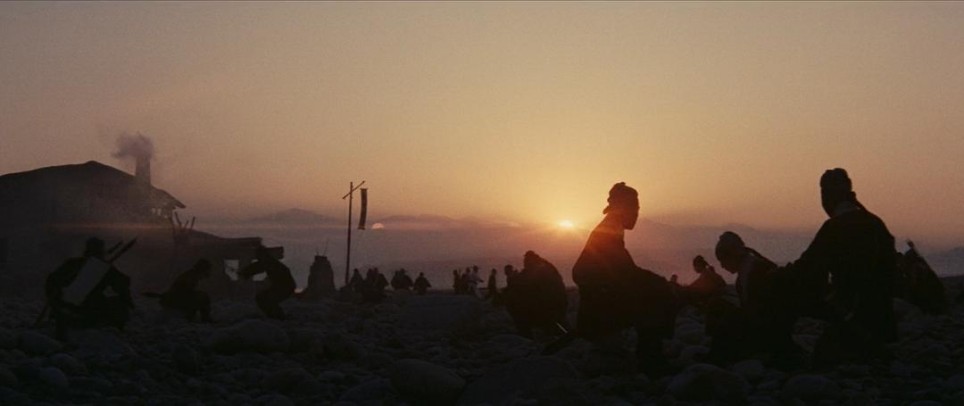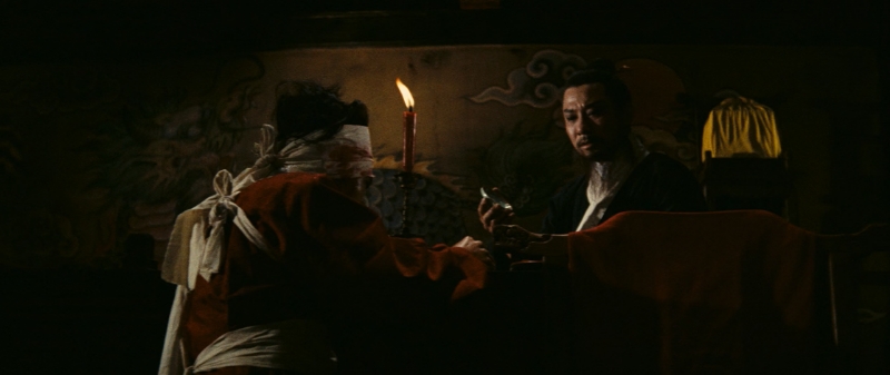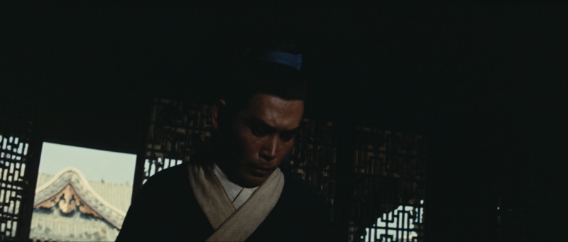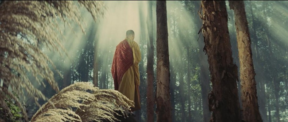 光照一事,胡金铨常常使用自然光与人工光照相结合的方式,并根据场景和意境进行调整。有时甚至会通过打底光这种反常光照来区分人物和背景,把人物从一体性中抽离(印象最深是最后那场追杀戏)。而在大部分场景中,他可能让人物与环境融为一体(我们前面讨论过了),也可能赋予人物某种神性。