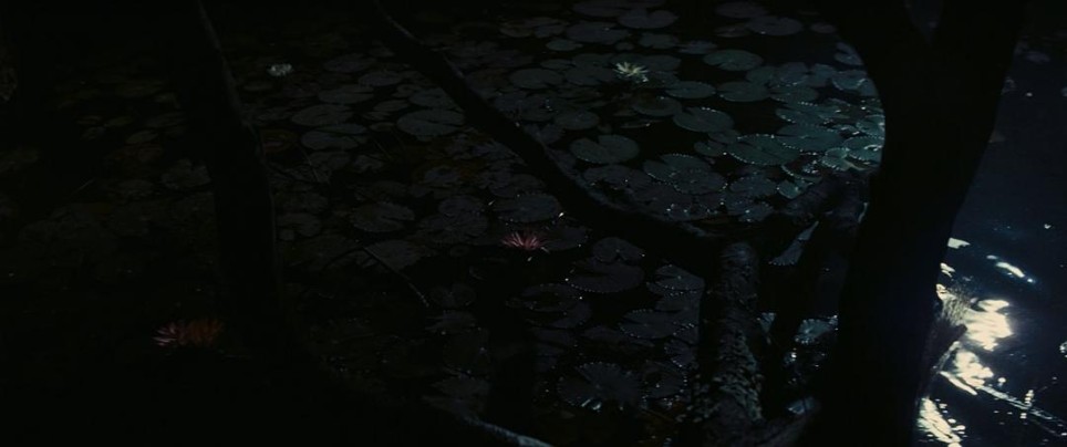 当然,电影中还有很对极其有意思的、创造性的视听语言。我举个人印象深刻的两个例子。第一个同为女主角弹唱一景,镜头通过模拟男主角的主观视角缓缓进场,随着女主角的歌唱而缓缓移动,女主角唱到莲花,镜头便移向莲池,观众通过观看代入了男主角的情绪,与女主角发生共情。这段镜头语言个人认为是相当朴实无华的实验,尝试将诗的意境视觉化,但是有给人以相对的惊喜感。