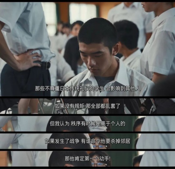 面对日益被侵犯、被剥夺的处境,学生们并没有逆来顺受。正如光在酒馆里所说的——“我们这一代人里,文美你并没有放弃啊”。文美的存在,既点亮了光的暗淡境遇,也同时为非日本籍同学们带来了非暴力抗议的火光。更为巧妙的是,文美对光的影响,间接导致了光对悠太的疏远。在如此时代,没人能独善其身,即便是“什么都不想”的悠太,也不得不被裹挟进去。