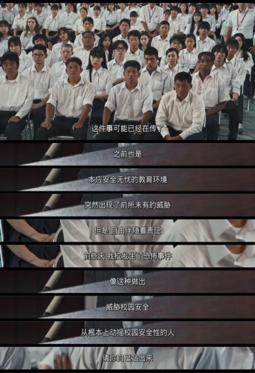 云、校园监控评分系统和城市里的高楼、立交桥、水泥板教学楼、抗震建筑一样,都是开场字幕所提到的“庞大高楼”的视觉符号。鬼头首相——校长——警察——自卫队军人,他们和前面的视觉符号互为表里,以言行、视觉的双重形式,压迫着高中生的青春。